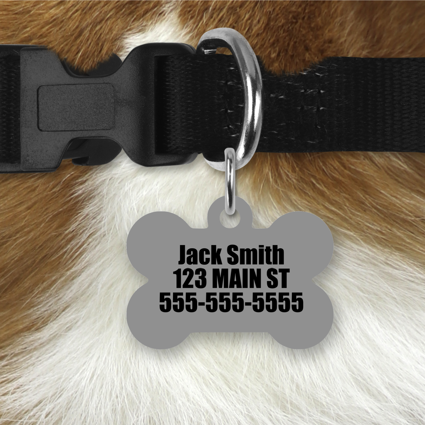 Double sided, light-weight aluminum pet tag in bone, heart or circle shape. Pet's name on front and contact info on back (up to 4 lines). Also includes D-ring to attach to collar. The back of tag will be a solid colour co-ordinating with the pattern on the front. Five different fonts to choose from for pet's name.